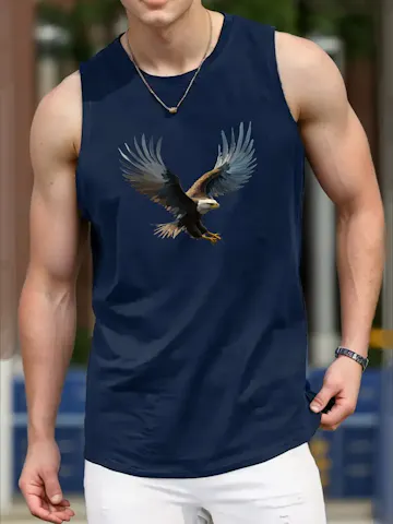 Eagle Print Tank Top, 1pc Men's Casual Knit Polyester Tank Top with Eagle Print, Summer Round Neck Sleeveless Vest, Stretch Fit Regular Size.
