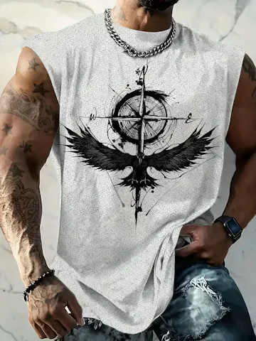 Tribal Graphic Tank Top: Men's Tribal Graphic Tank Top - Sleeveless 3D Print Crew Neck, Beige with Black Compass & Wings Design.